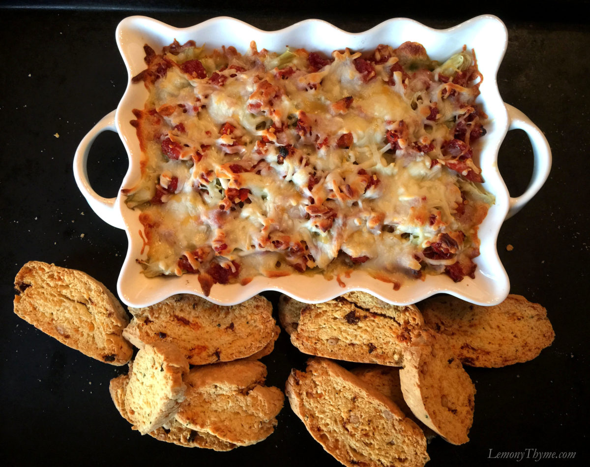 7-Layer Hot Italian Dip is that easy and ready to be served in less than 30-minutes. Be sure to keep these key ingredients on hand for your next happy-hour or game day party. We served this yummy appetizer with Cheddar-Parmesan Savory Biscotti. The flavor combinations were wonderful together.