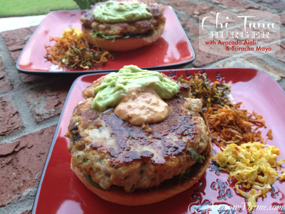 Ahi Tuna Burgers {with Avocado Aioli & Sriracha Mayo}