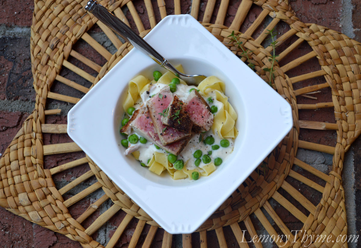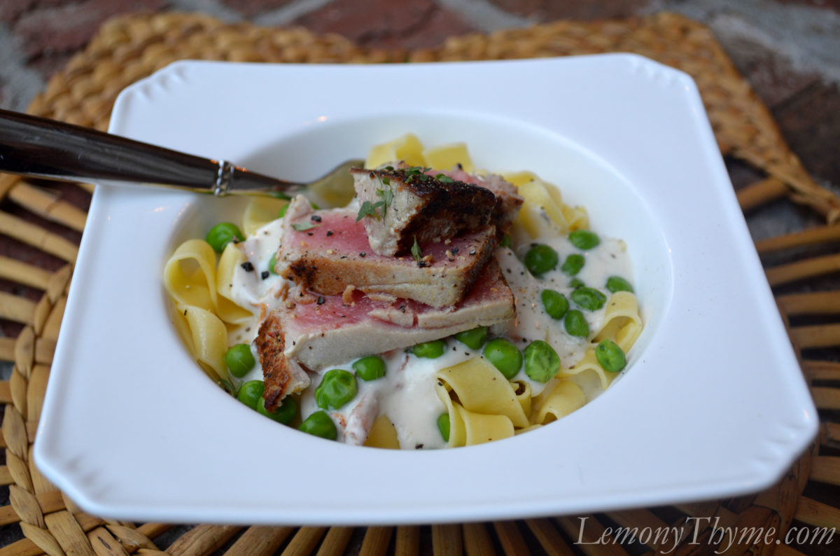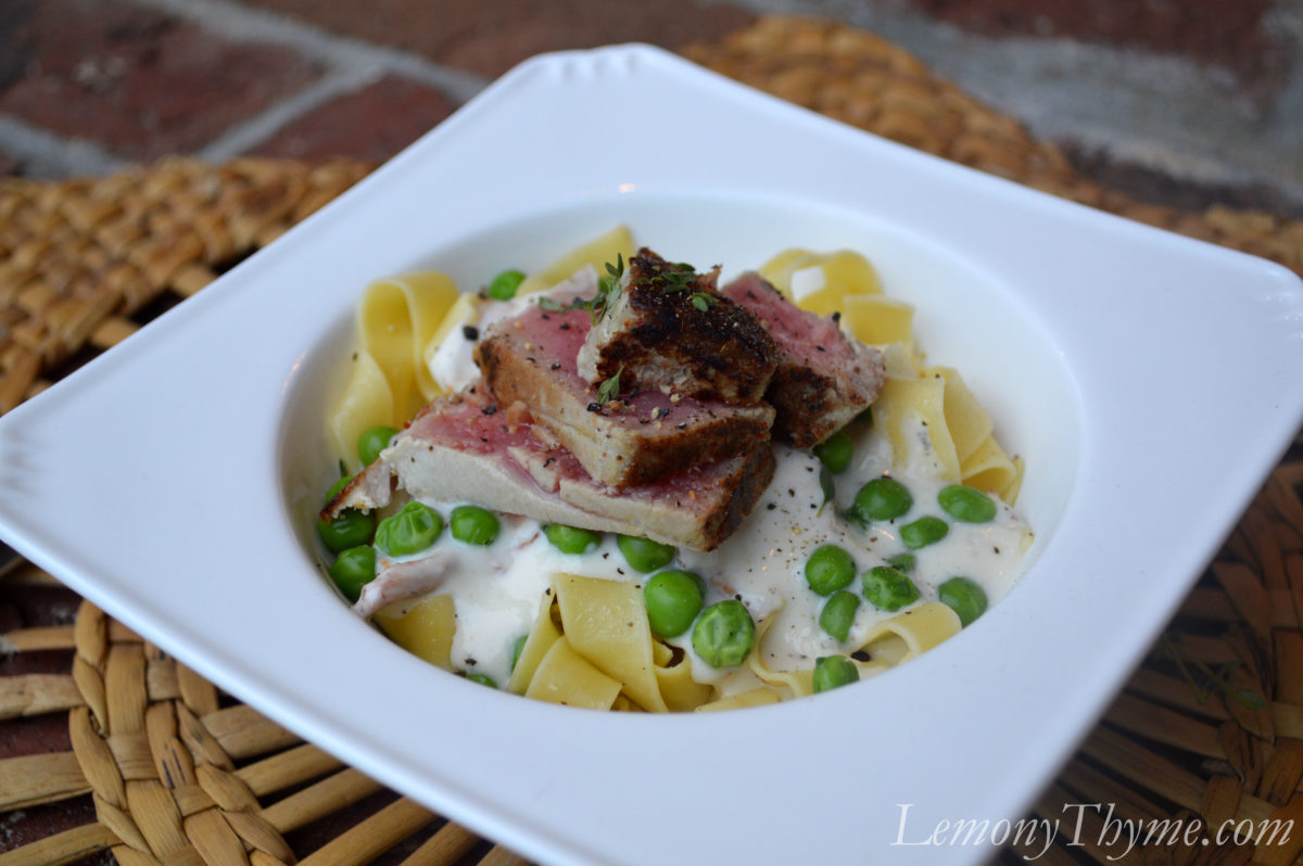 For the other components of this dish, I used some beautiful Tagliatelle pasta (long medium width noodles), a creamy sauce infused with lemony thyme and Morel mushrooms, and a handful of green peas. Top those layers of goodness with seared Ahi Tuna and you’ve got a fabulous recreation of a classic comfort food dish.