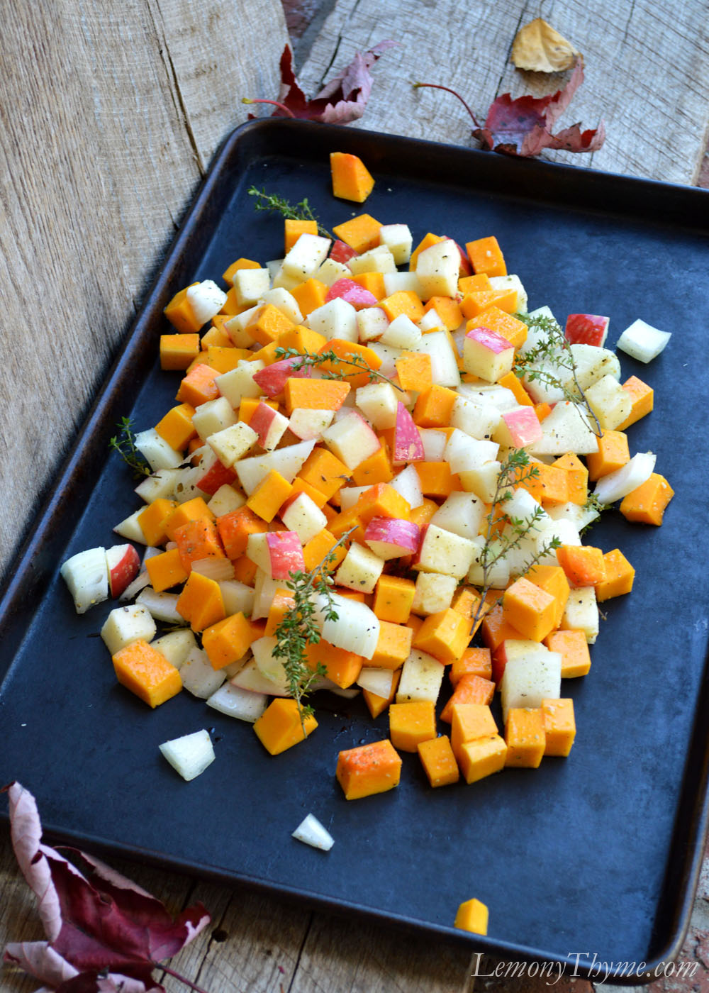 • Toss diced apple, butternut squash, and onion with 2 Tbl. olive oil, salt & pepper. Spread in a single layer on a cooking spray coated baking sheet. Roast for 25-35 minutes until veggies are tender.