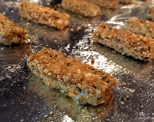 First thing to do is freeze your cheese sticks. This helps keep the cheese from oozing out during baking. Cut them in half, then roll them in flour, dunk in egg whites and coat in seasoned parmesan panko/Italian bread crumbs before baking. A little olive oil spray goes a long way towards achieving golden goodness.