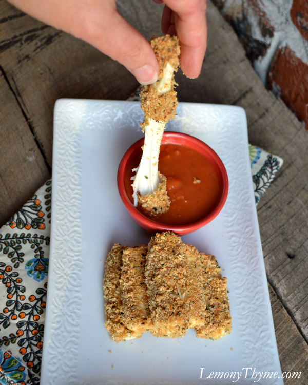 It’s all about comfort in this house and I’m proud to say that we’ve learned to adapt to a lighter lifestyle. Our Baked Mozzarella Cheese Sticks start with Weight Watchers String Cheese. They’re just 1 Pts+ per cheese stick BEFORE you bread them. I decided to cut them in half so that after breading each piece is still just 1 WW Pts+.