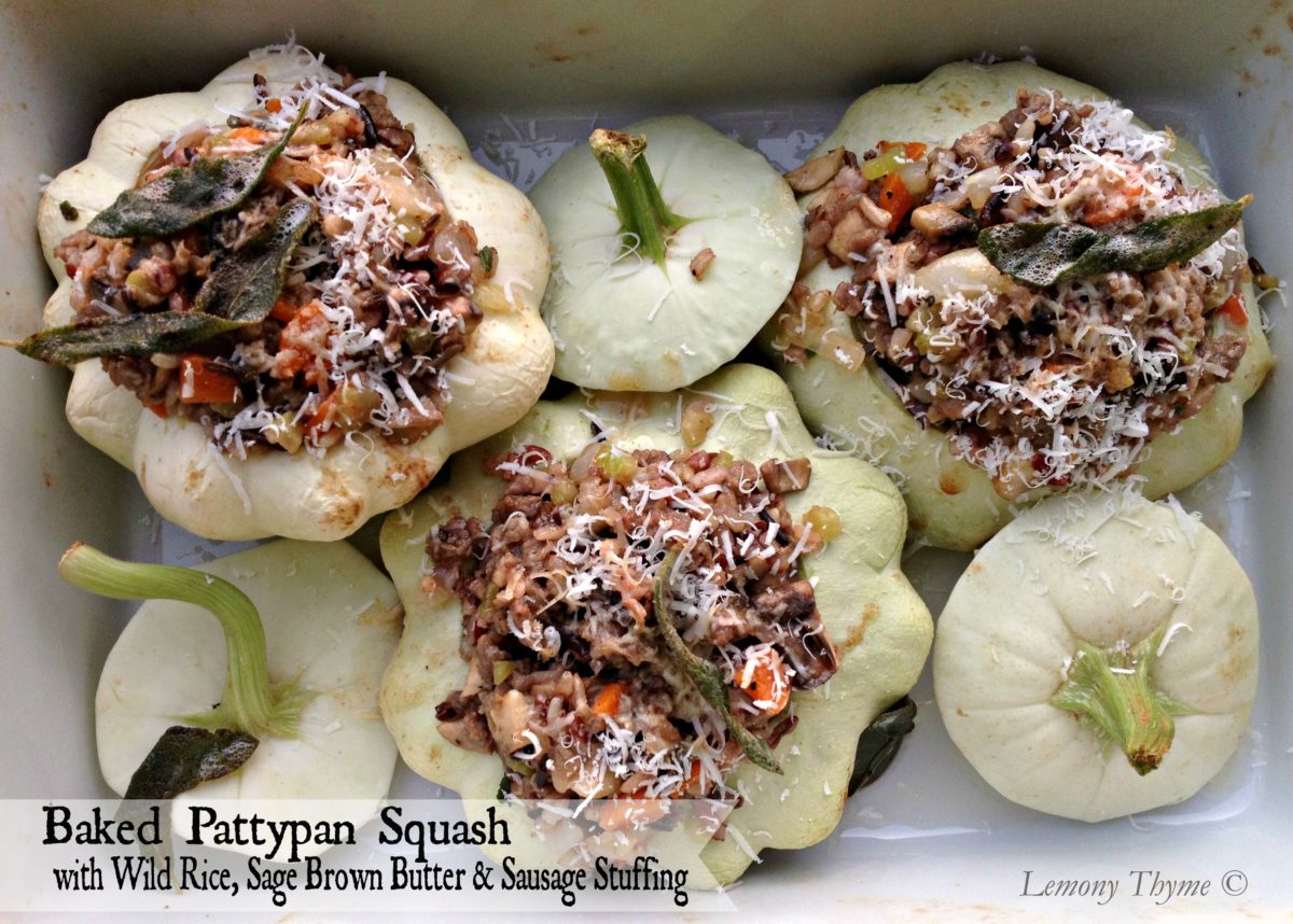 Baked Pattypan Squash with Wild Rice, Sage Brown Butter & Sausage Stuffing