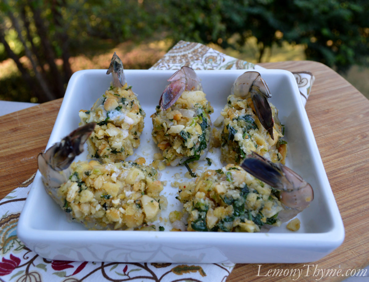 Once the stuffing was prepared, I let it to cool slightly then used my hands to form it into balls which I placed on each shrimp, allowing the tails to drape over (as shown above). At this point the shrimp can be chilled and reserved until ready to bake or up to 8 hours. Right before baking, melt a tablespoon of butter and drizzle a little over each mound of stuffing.