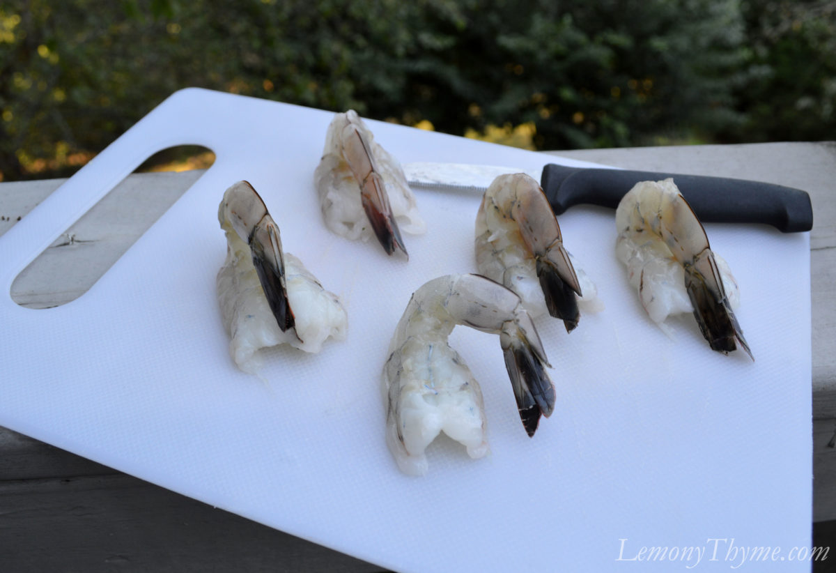 I bought five gorgeous jumbo shrimp. Once peeled (leaving tails attached) I used a small pairing knife to cut a channel along the back of each shrimp. This allowed me to remove the ‘vein’ and also allowed me to flatten them out a bit so they would sit as shown above.