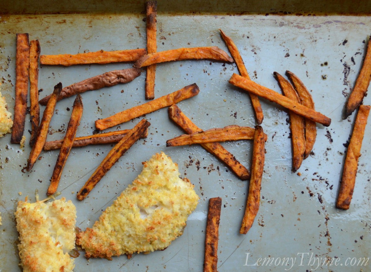 Parmesan Crusted Homemade Fish Sticks went oh so nicely with our Baked Sweet Potato Fries. In fact, they split the fare for the cookie sheet and baked along side of each other. Now that’s teamwork.