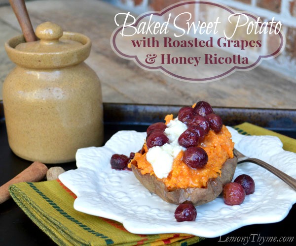 - To serve, cut the top third off each sweet potato and scoop out their flesh. Mash with butter, cinnamon, nutmeg, salt & pepper. Return potato to two larger skins. Mix ricotta cheese with 2 Tbl. honey. Spoon equally onto potato halves. Top each potato with a spoonful of roasted grapes and a drizzle of honey.