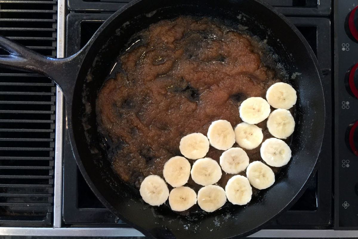 - Melt butter in cast iron skillet. Remove from heat and stir in brown sugar. Arranged sliced bananas over brown sugar. Once inverted this will be the top of your cake.