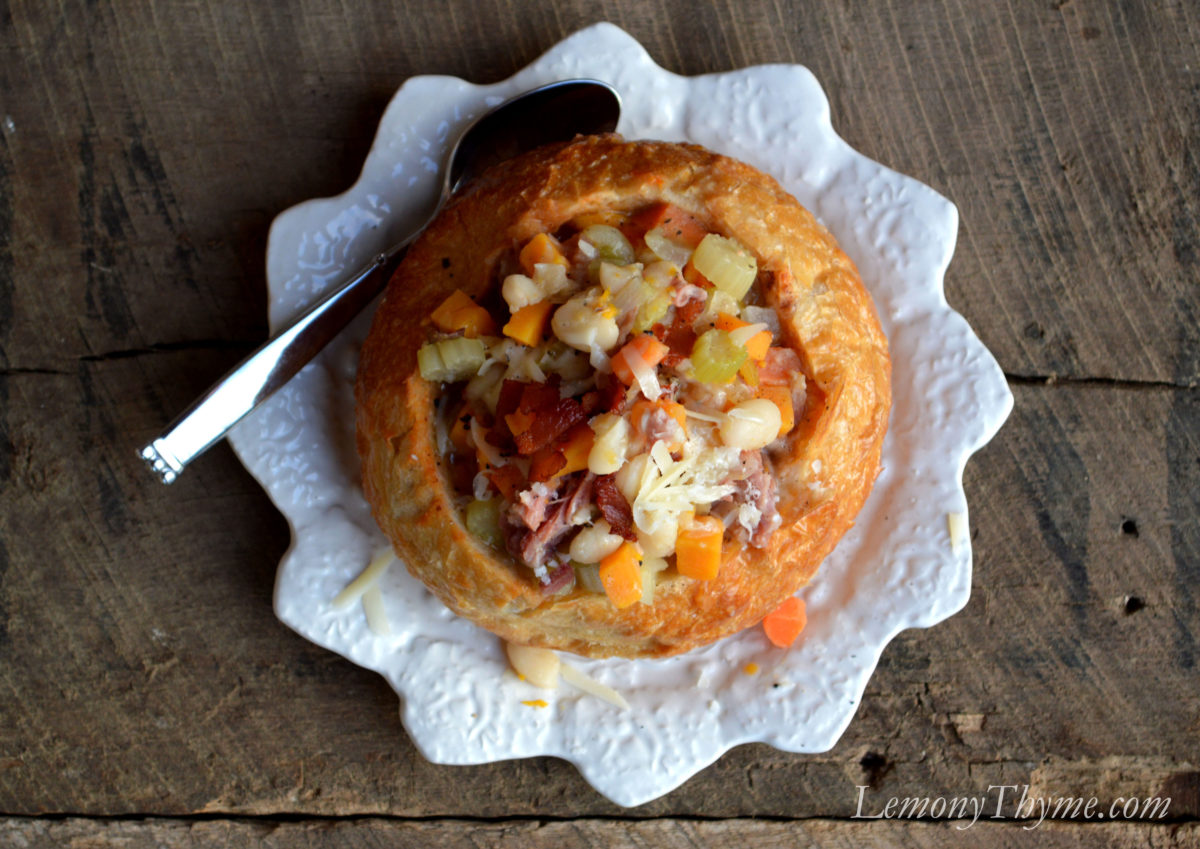 Recipe tip: We had a ham bone in the freezer that was ready for prime time. However, if you don’t, check with your local Honey Baked Ham store. They’ll often sell them fairly cheap ($5.00 range) and they still have a nice amount of meat on them. Or you can skip the ham bone completely, use a nice rich chicken stock, and add a little extra bacon.
