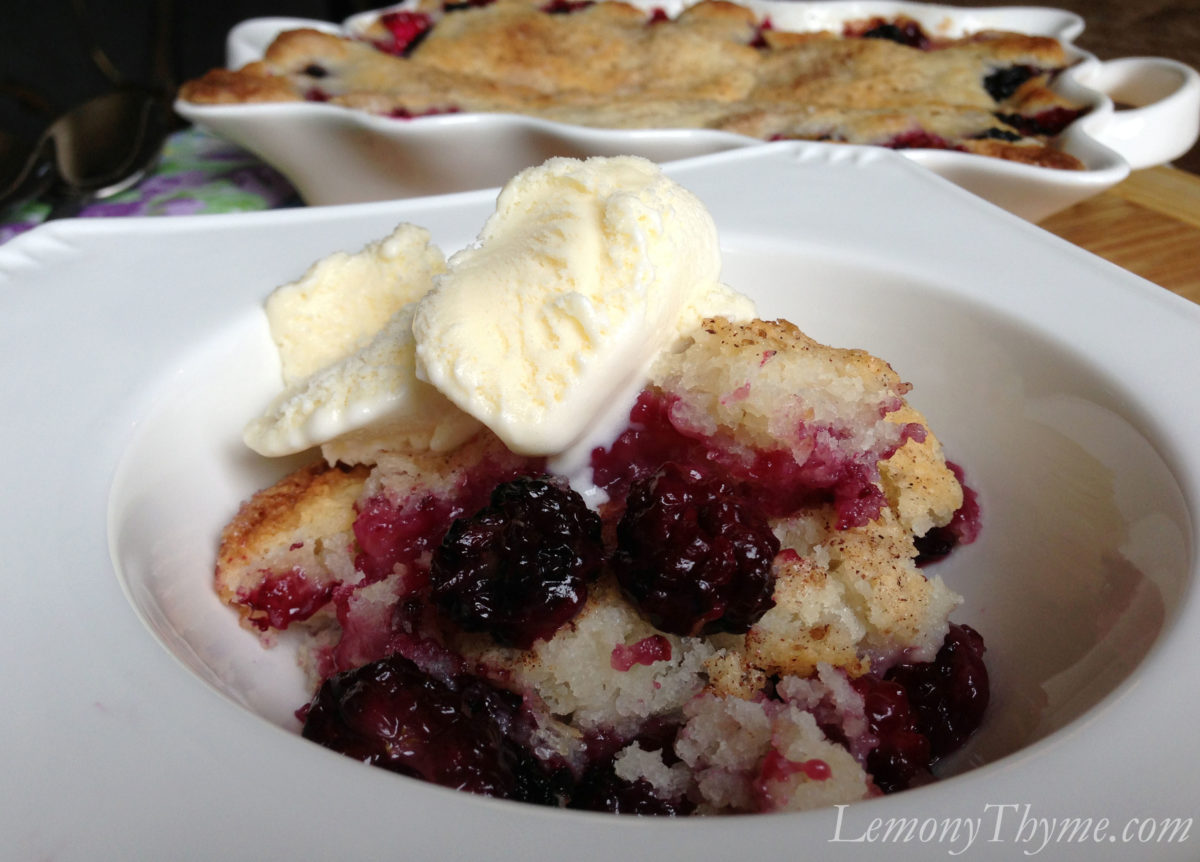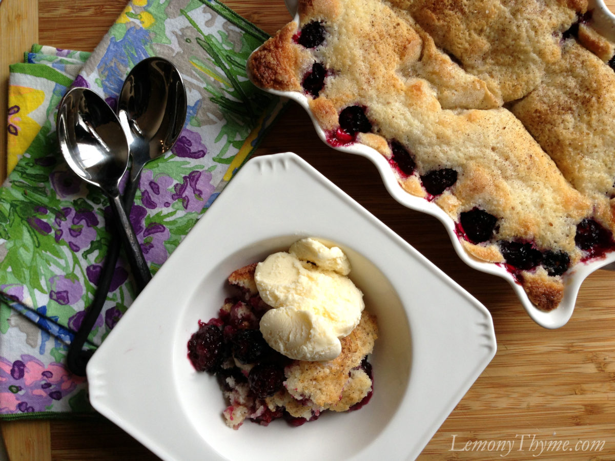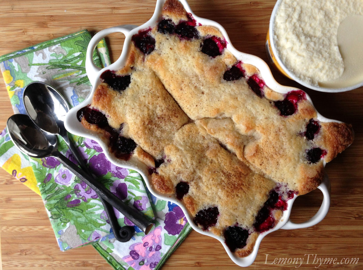 I’m new to your site and immediately thought you were going to have some lemon juice and chopped thyme in this cobbler–since both would add a delicious twist of sophistication. I still may try that version. But I digress. Your photo shows the traditional cobbler crust on top of the berries, but your recipe is just the opposite, which may or may not work as well. I’m surprised no one’s mentioned this. Nonetheless, I’m a big fan of picking wild blackberries and your recipe is a reminder of a delicious way to serve them. Thanks!