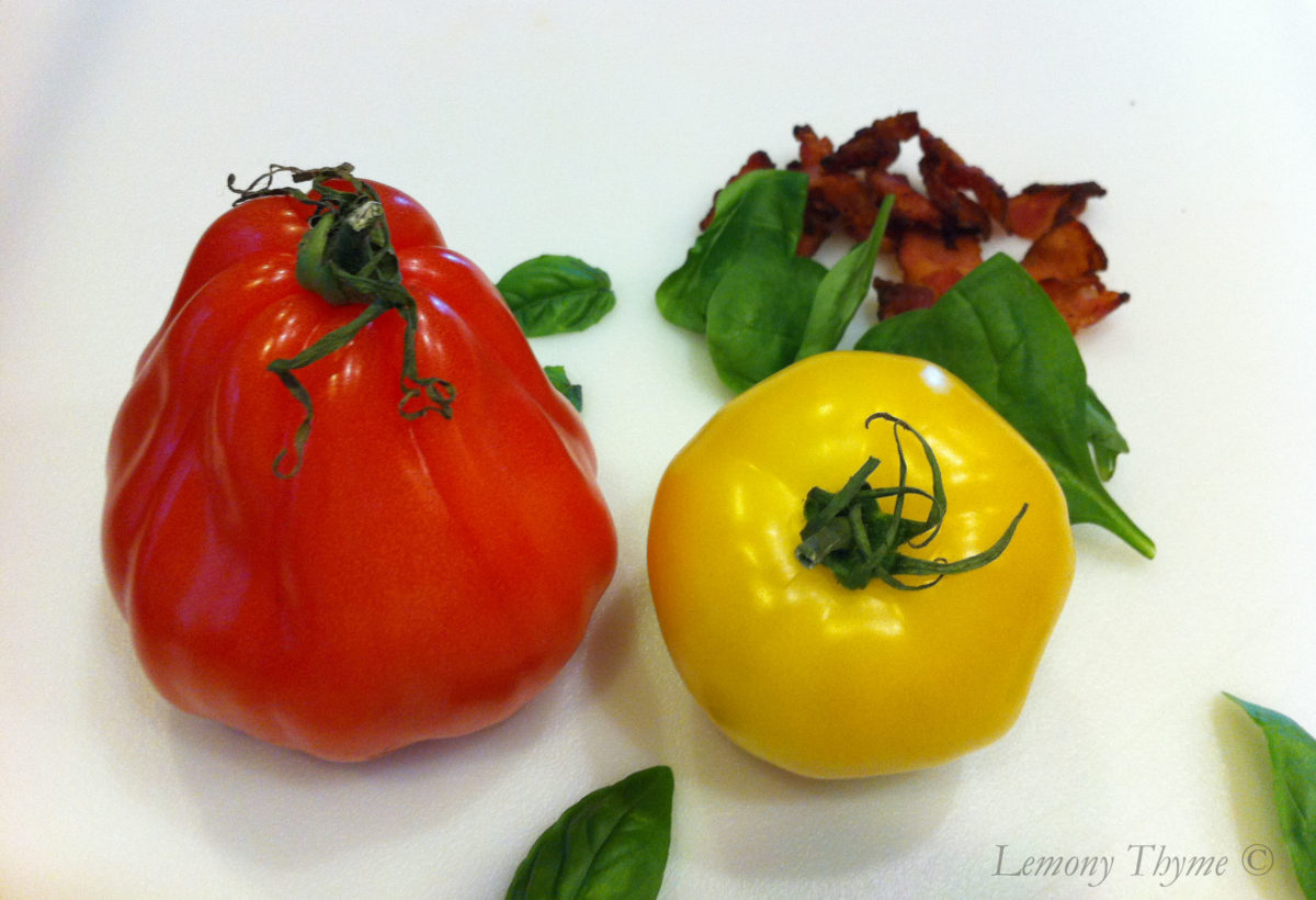 The tomatoes are coming, the tomatoes are coming. Are you as ready as we are for some nice vine ripened heirloom tomatoes? They are such a wonderful treat no matter how you serve them. I decided to stack them up for fun and dress them with a little fresh herb mayo and crispy crumbled bacon.