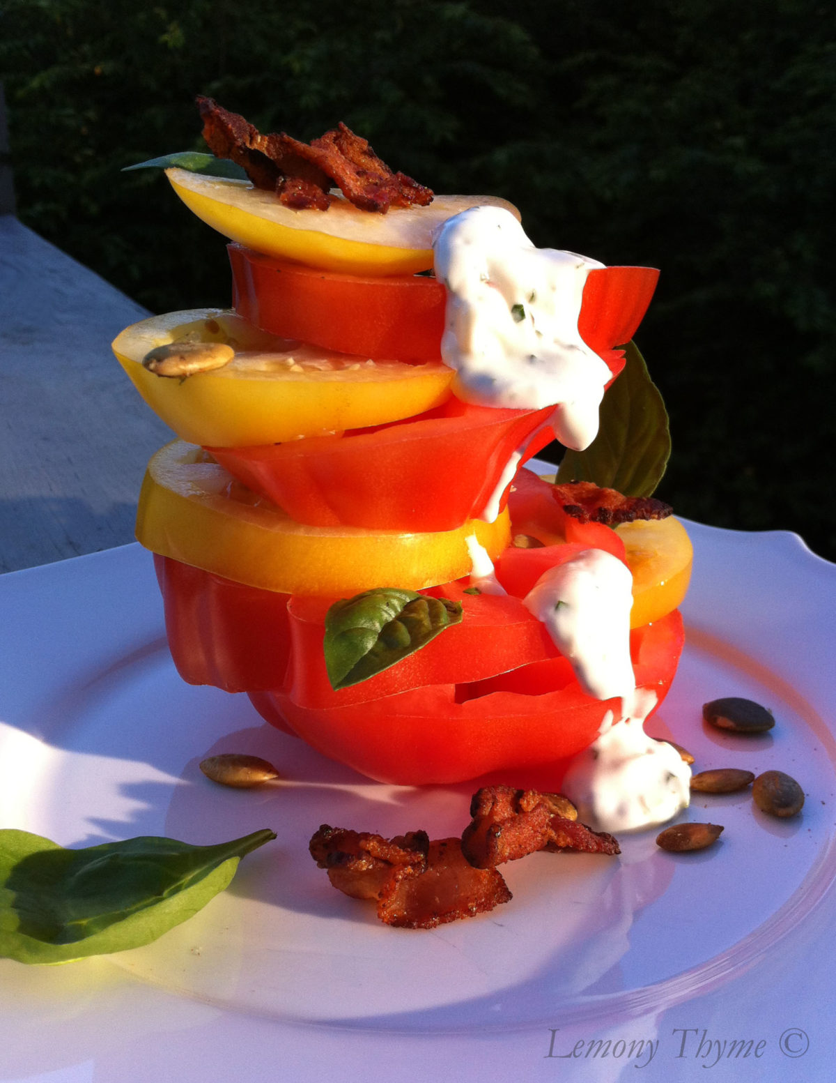 - Stack sliced tomatoes in a tower, alternating the tomatoes by variety. Sprinkle with fresh greens, crispy crumbled bacon, and pepita seeds, then drizzle with fresh herb mayo.