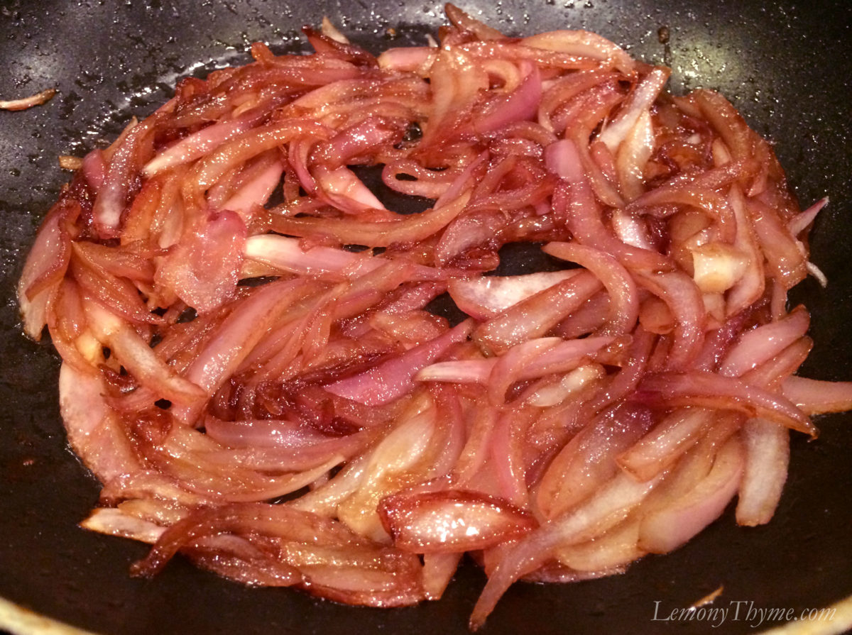 The onions are sautéed until tender then kicked up with brown sugar and balsamic vinegar. I chose blueberry balsamic, any flavor or plain balsamic would be just fine.