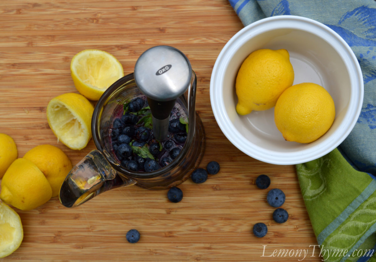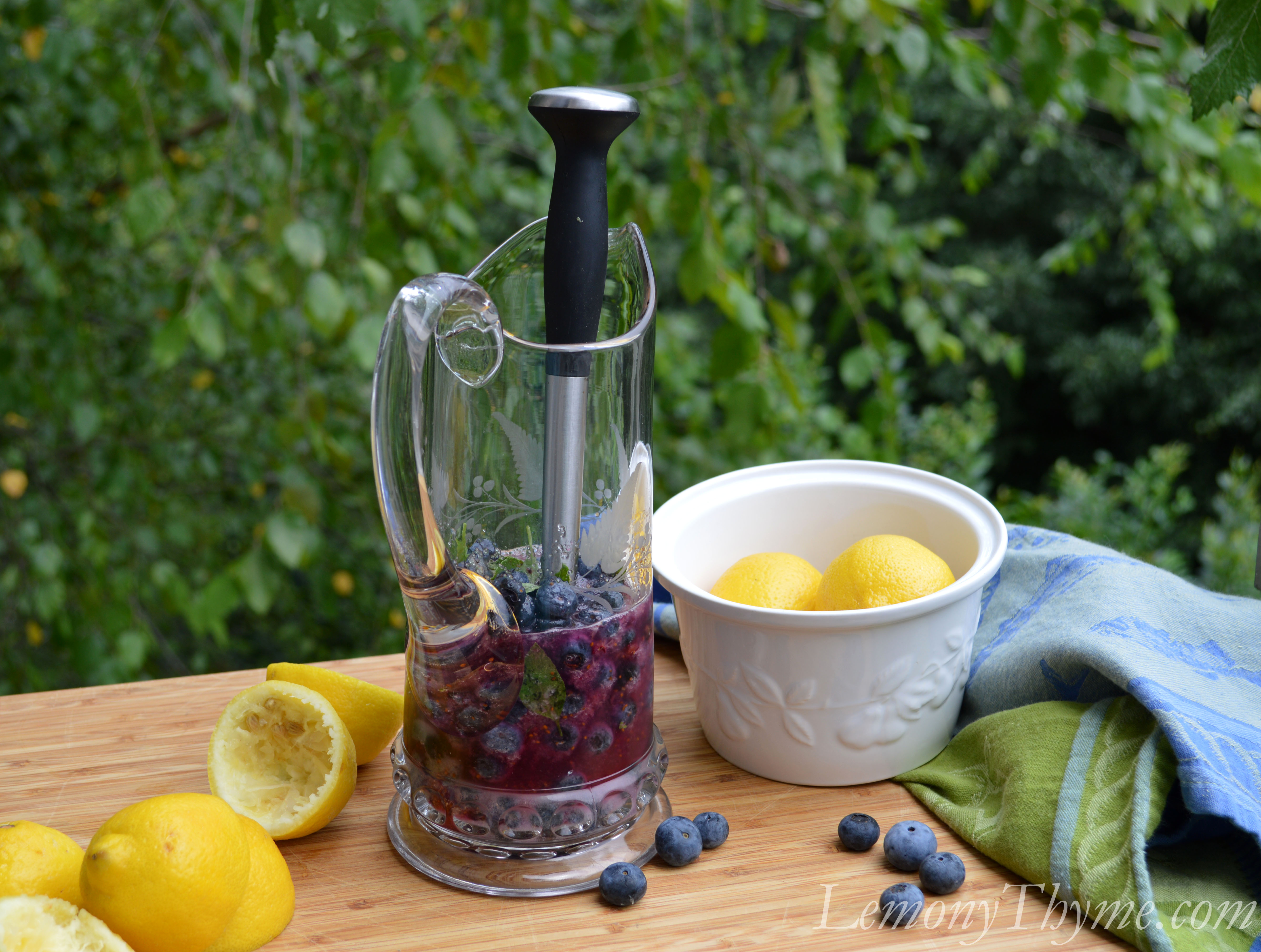 - Pour lemon juice into a pitcher. Add blueberries, basil, and sugar to the pitcher and muddle. Add water and allow to stand for 30 minutes. Pour through a fine mesh sieve into a bowl; discard the solids. Return mixture to the pitcher. Serve chilled over ice.