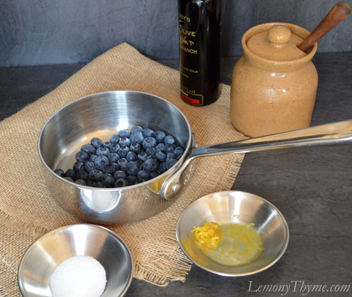 - In a small sauce pan over medium-low heat add blueberries, sugar, lemon juice, lemon zest, honey, and balsamic. Cook stirring occasionally for 4-5 minutes just until blueberries begin to burst. Remove from heat and allow to cool.
