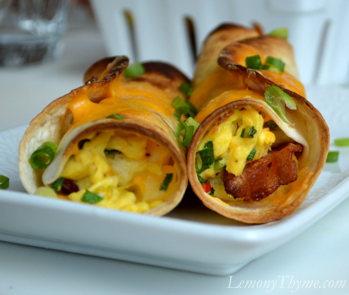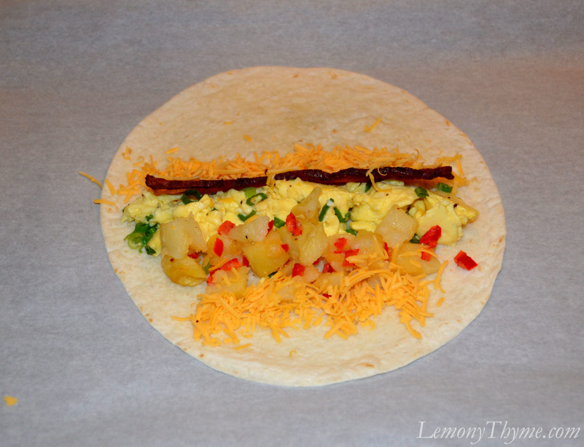 On top of each flour tortilla you’ll see shredded cheddar cheese, a nice crispy piece of thick cut applewood smoked bacon, scrambled eggs with sliced scallions, home fried potatoes with diced red pepper, and a little more cheese for good measure. I rolled them as tight as a I could and secured them with a toothpick.