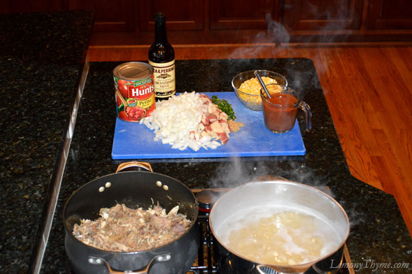 It was pulled pork roast for dinner on Saturday night, reserving enough for Brunswick Stew the following day. On Sunday morning we got busy shredding pork and chicken (love cooking together), dicing up onion, new potatoes, jalapeno and garlic.