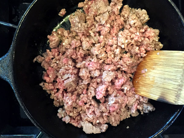 - Brown ground beef over medium heat, breaking into small pieces with wooden spoon; drain.