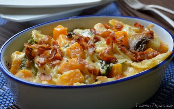 • Stir in fresh spinach, butternut squash, and pasta. Pour into a buttered casserole dish. Sprinkle with crumbled crispy bacon (optional). Bake for 20 minutes.