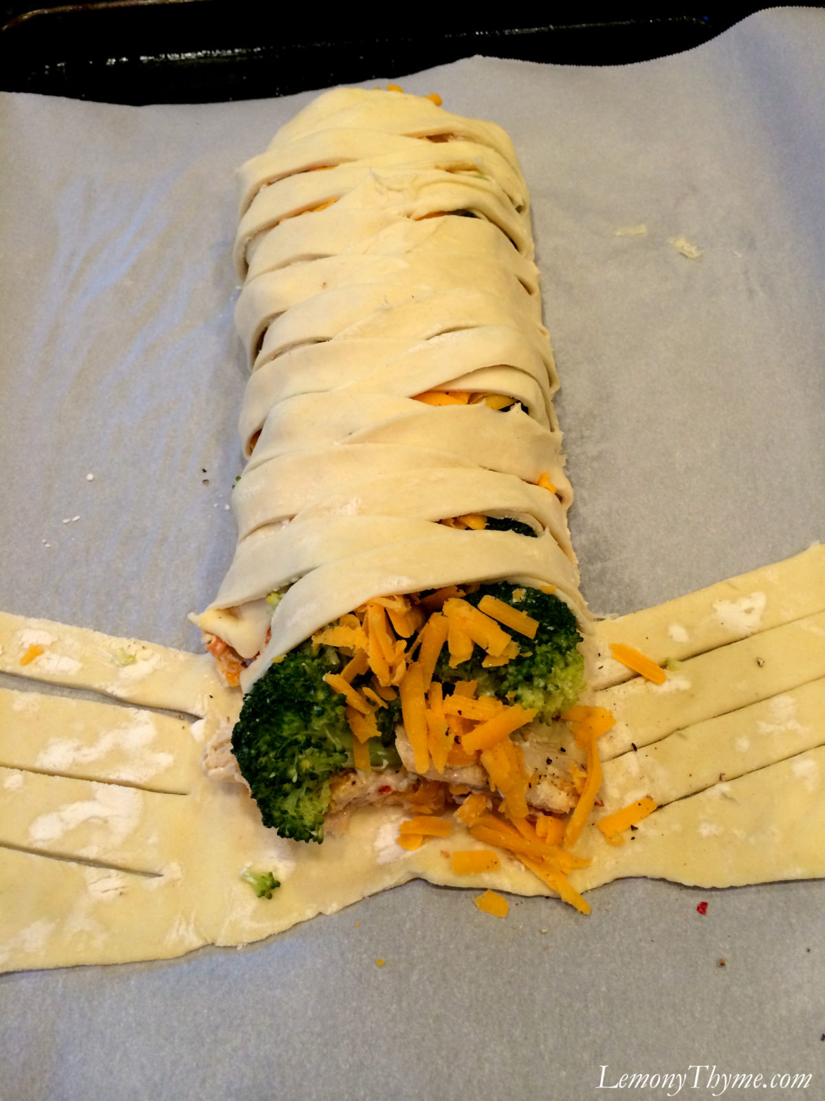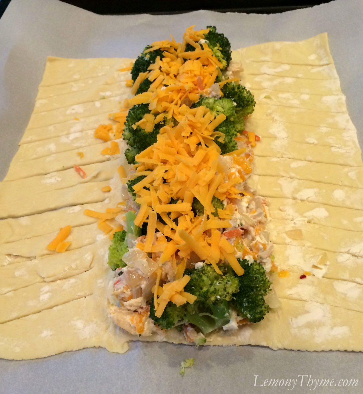 I combined steamed broccoli & carrots, cooked chicken, and sautéed onion with cream cheese and shredded cheddar cheese. Simply season to taste and you’re ready build your Stromboli.