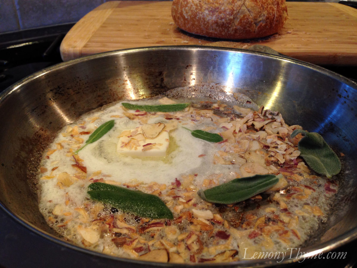 - In a small skillet, melt butter, add in fresh sage, garlic and shallots. Cook over low heat until garlic is tender and sage if fragrant. Add in sliced scallions and stir to combine. Remove from heat.