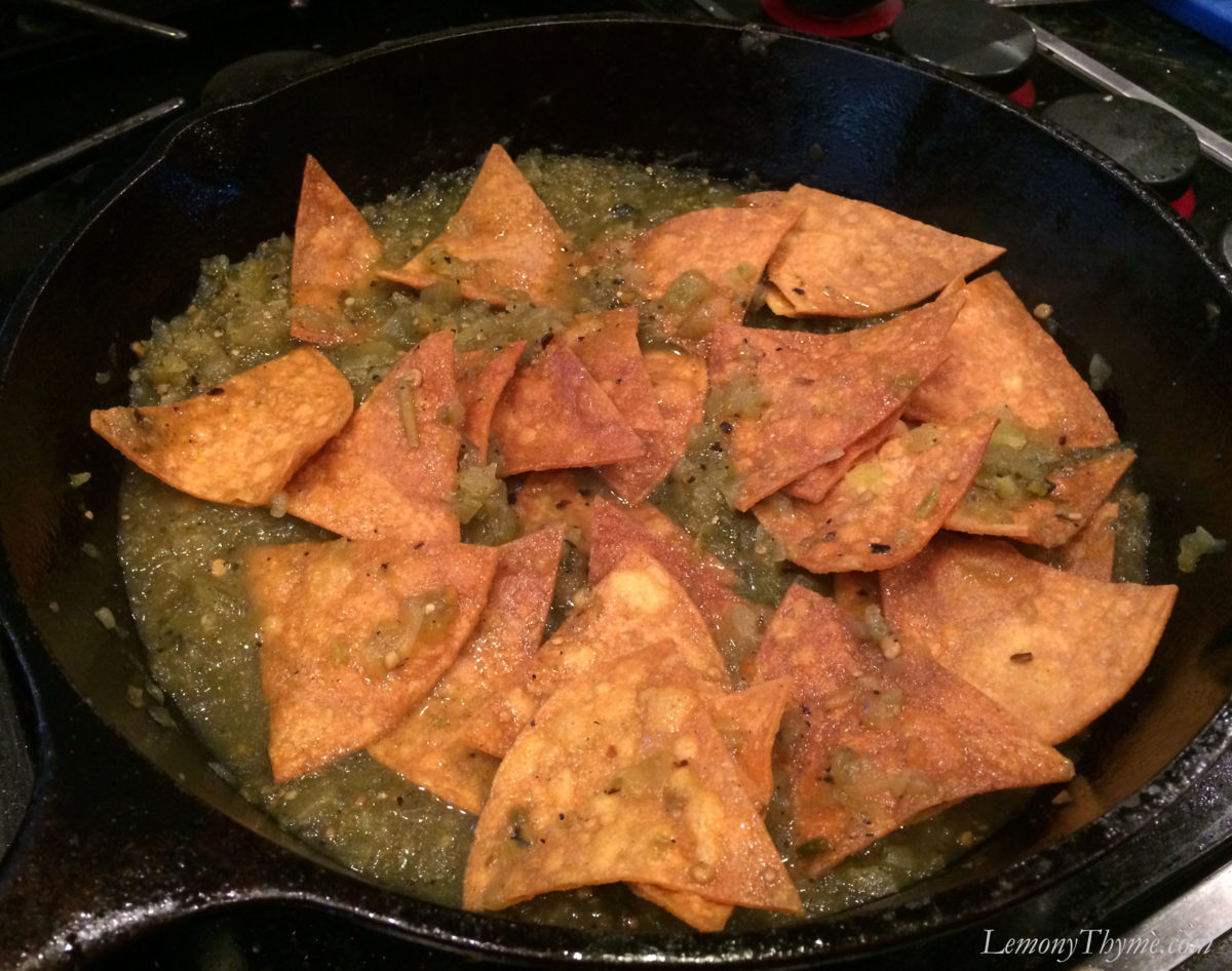 - Add 1 Tablespoon of oil to skillet over medium-low heat. Add salsa verde and cook for 2-3 minutes. Gently add in crispy tortilla triangles and turn to coat. Simmer for another couple minutes. Sprinkle with shredded chicken and heat through. Meanwhile, fry eggs.