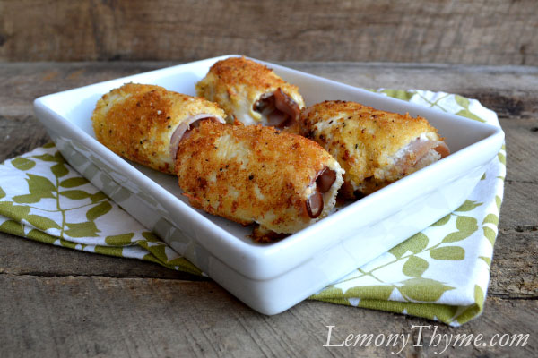 Thinly sliced chicken breasts are layered with sliced Virginia ham and muenster cheese then rolled tightly and coated in Dijon herb mayo and seasoned panko breadcrumbs.