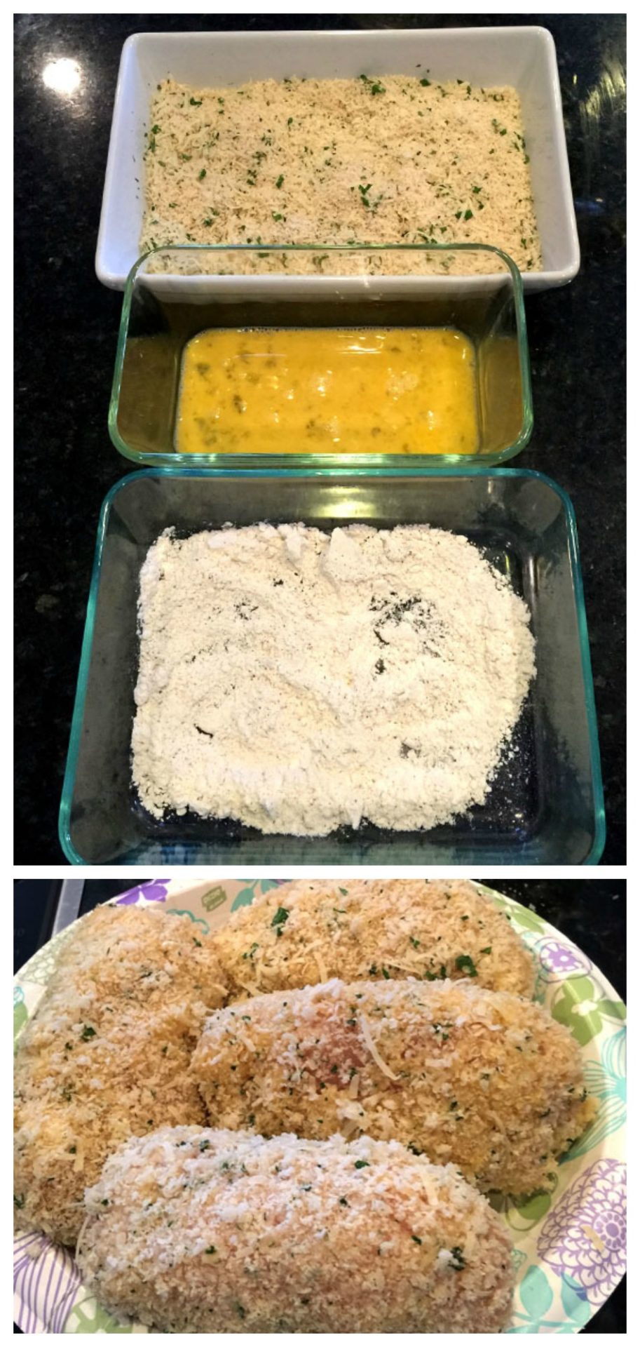 - Set up breading station with flour (seasoned with salt & pepper) in one dish, beaten eggs in a second dish, and panko/parmesan/parsley in a third dish. Dip each chicken roll into flour, egg, then panko mixture and repeat. Be sure to press breadcrumbs. Continue with all chicken rolls then freeze for one hour.