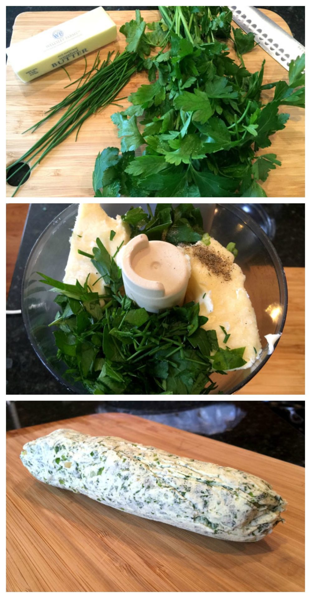 For the compound butter, you can use your favorite soft herb combination, we chose flat leaf parsley and chive. For more about Fresh Herbs, check out my article here. The herbs are combined in the food processor with a good amount of minced garlic (3-4 cloves), a stick of softened butter and a pinch of salt & pepper. Process until finely chopped and well combined. Roll into a log shape in plastic wrap and freeze.