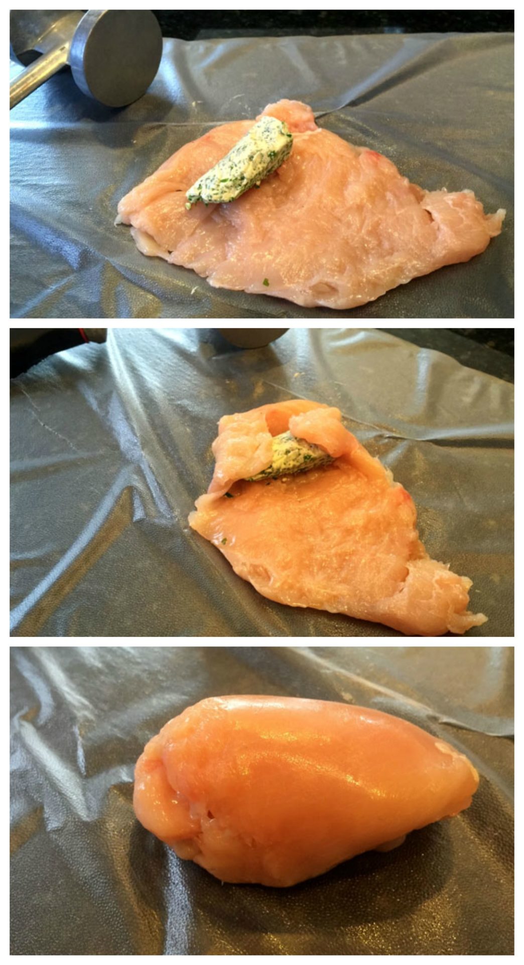 - Place butter on each chicken piece, fold in edges and roll chicken tightly around butter, completely encasing. Repeat with remaining chicken. Freeze for 1 hour.
