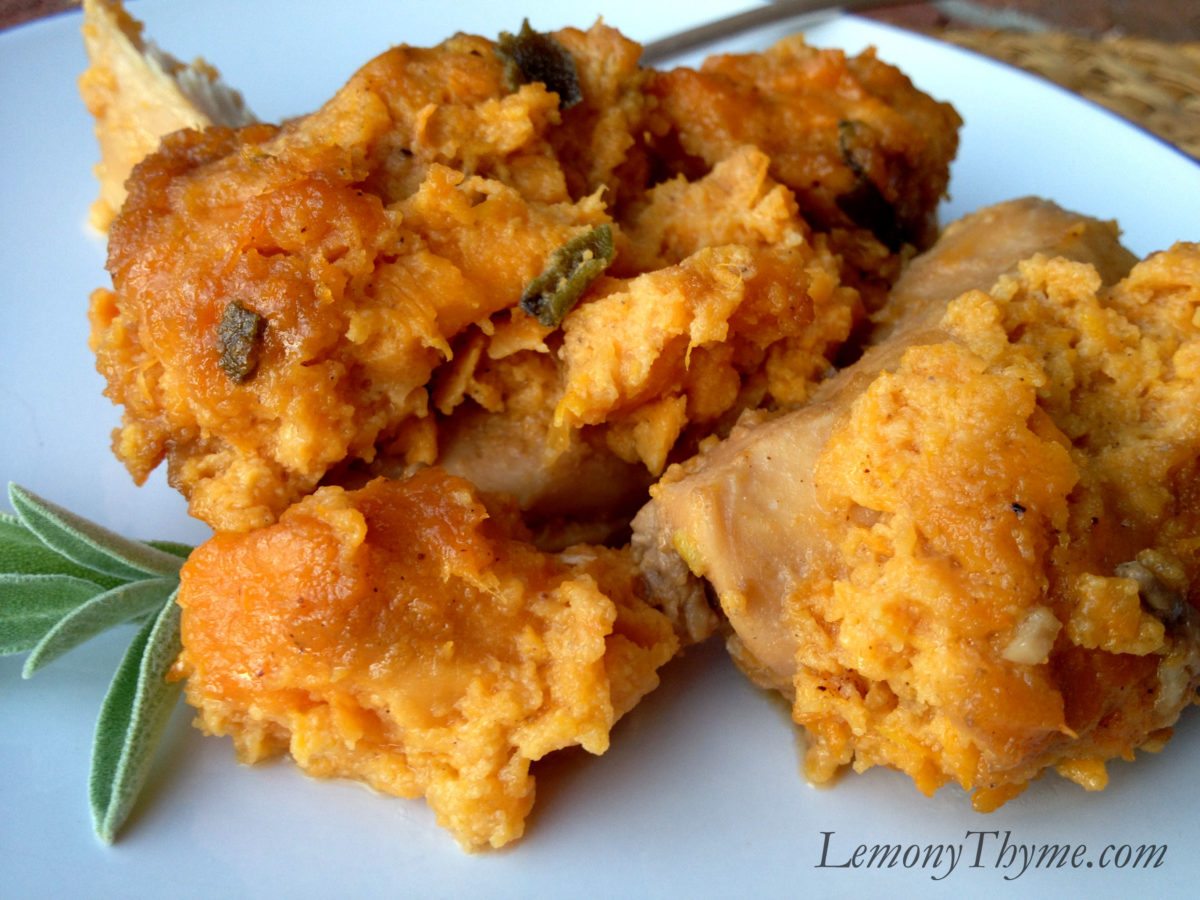 This recipe is created from the lingering flavors I’ve kept on the tip of my tongue since Saturday evening.  Our table decided that the chicken was definitely slow cooked in the sweet potato goodness.  It was moist and took on the familiar flavors of a yummy sweet potato casserole.  I was tempted to top the whole thing in a layer of buttery brown sugar and pecan goodness….but I held back.  While this dish was sweet….it had a savory side to it as well ;)