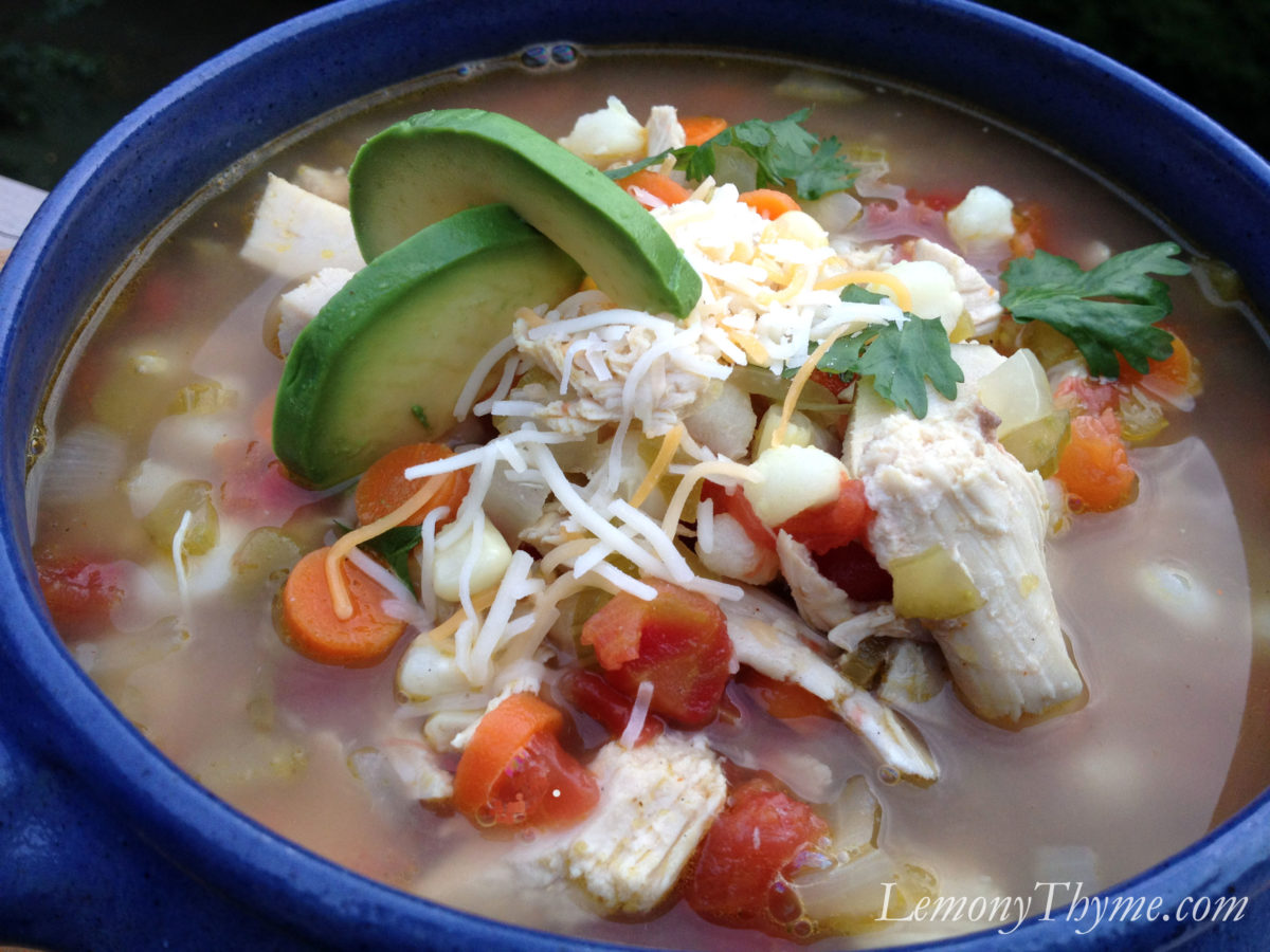 Chicken Tortilla Soup is built upon a Roast Chicken and the amazing broth that follows. A base of a simple mirepoix of onion, carrot, celery combined with a few quick adds (Rotel, hominy, mild green chiles, and frozen corn). Season with some classic Mexican flavors like cumin, chili powder, oregano, and cayenne. Serve with grated cheese, sliced avocado, fresh cilantro, and tortilla strips.