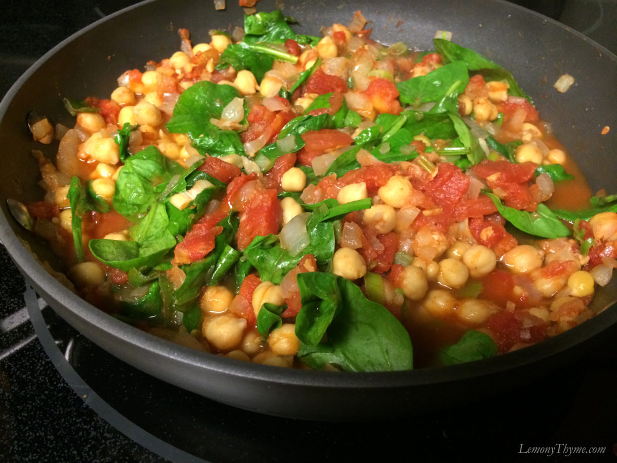 - Add diced tomatoes and chickpeas and simmer for 3-4 minutes. Use a potato masher to gently break some of the chickpeas. Reduce heat to low, add fresh spinach and cover allowing spinach to wilt for 2-3 minutes.