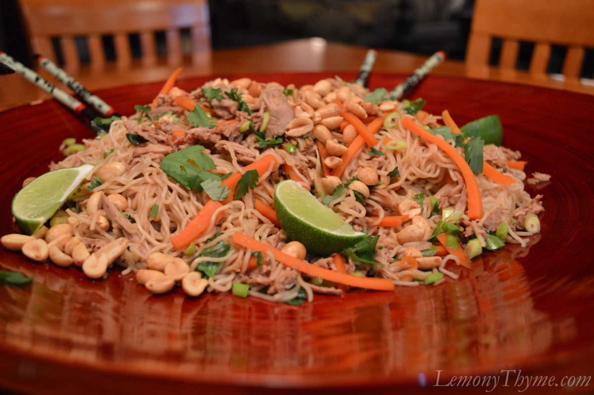 - Turn slow cooker off. Add in pork, cooked noodles, carrot, scallions, and cilantro, tossing to coat. Pour mixture into a large serving bowl. Sprinkle with peanuts and fresh cilantro. Serve with lime wedges.