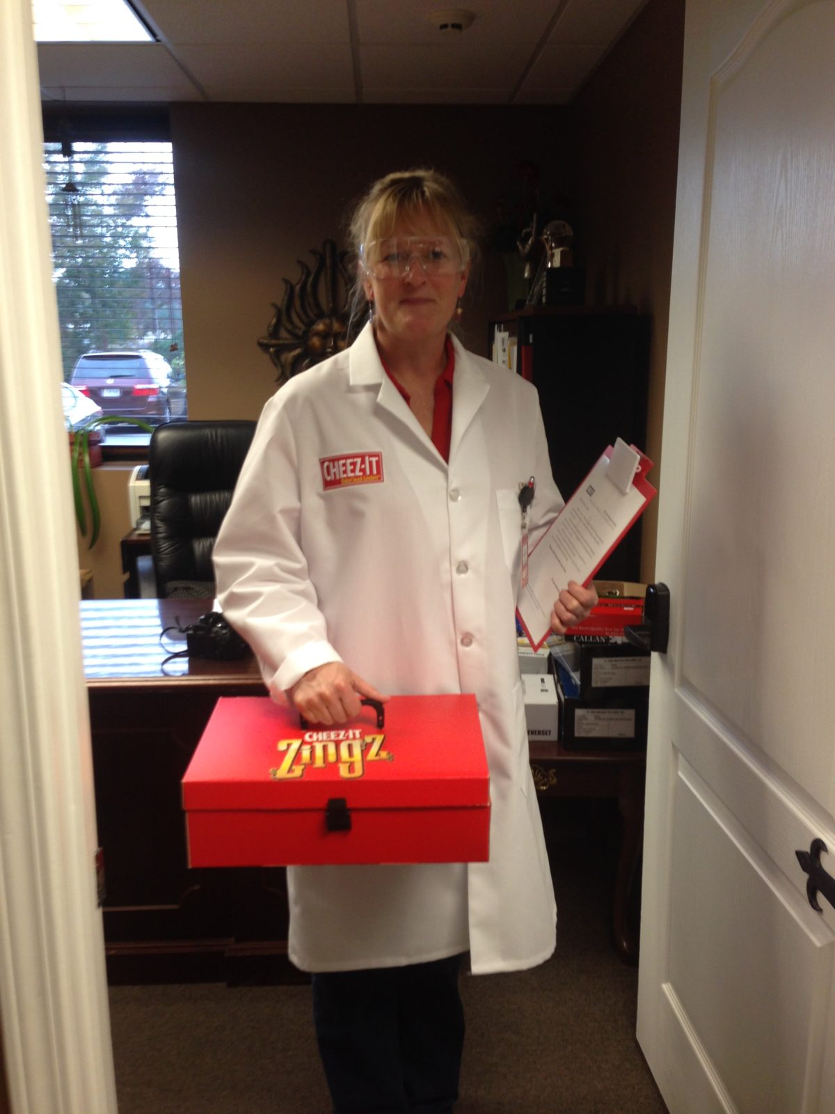 Yes, that is a full length monogramed lab coat, complete with crunch-proof testing goggles, my official company badge, pen, clipboard, and a flavor and crunch analysis card (remember mood rings….it has that kind of technology…Mmm Hmm). But even bigger than that is that we got a sneak preview of two incredible new Cheez-It flavors that pack a big crunch punch!