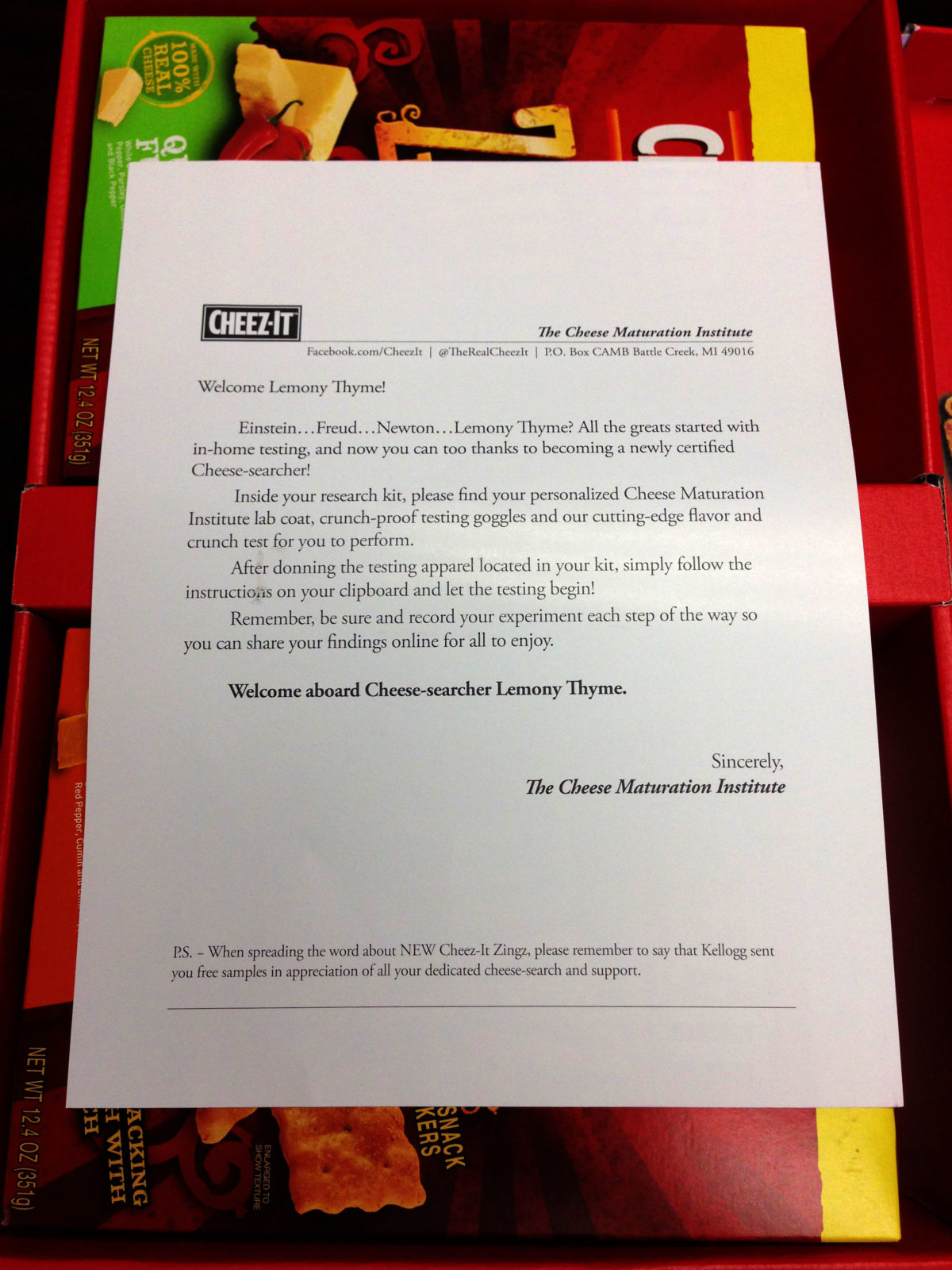 Hehe. I am pleased to share that I was selected to be a Cheez-It Cheese-searcher. I received my “research kit” (one of the best marketing pieces I’ve seen) and inside was this letter. I’ll let you read it.
