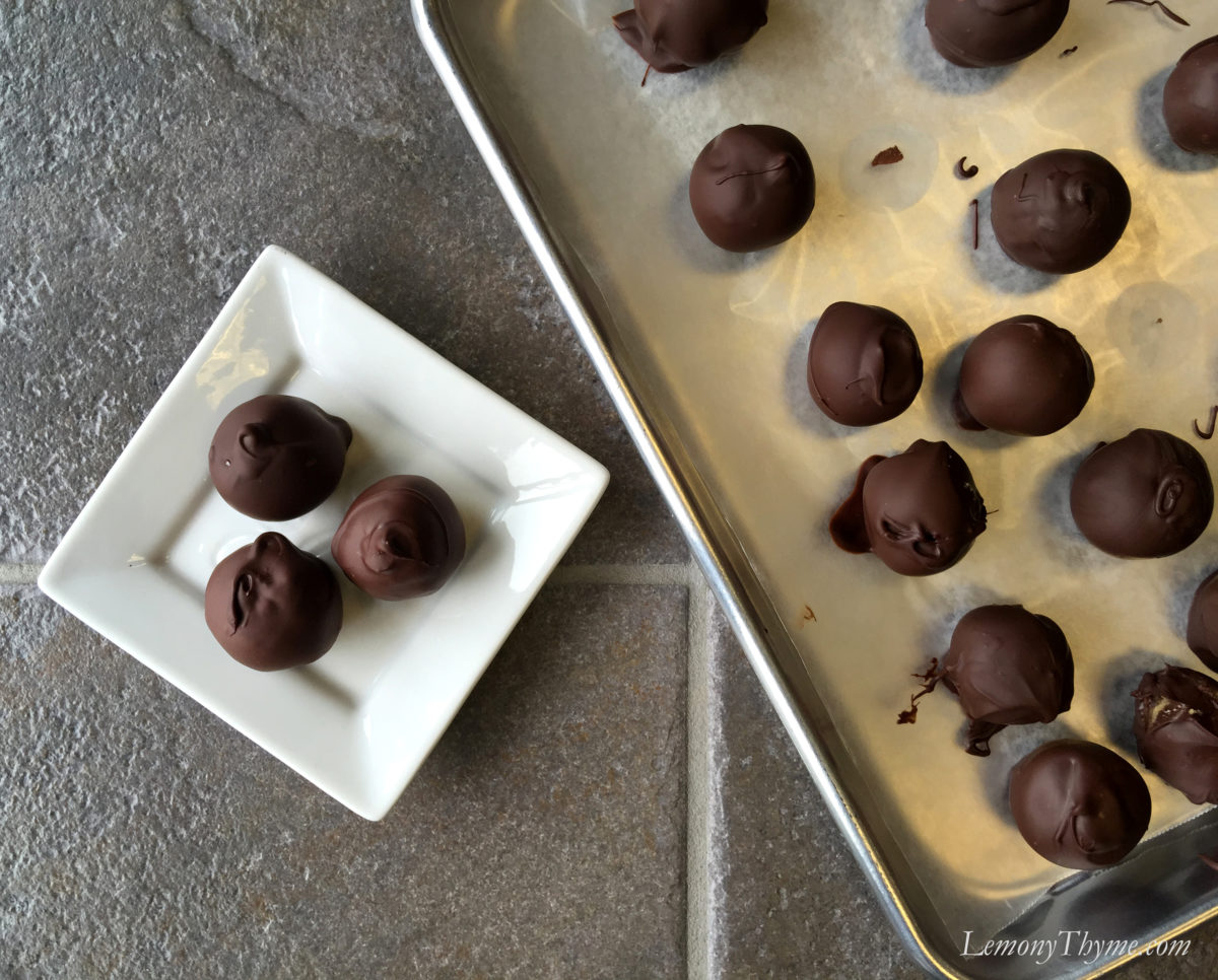 • Remove dough from freezer. Using toothpick, dip each in melted chocolate and place back on parchment lined baking sheet. Once all are dipped, return to refrigerator for 5 minutes to set chocolate.