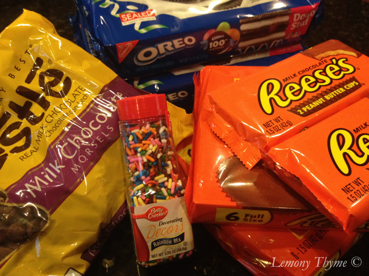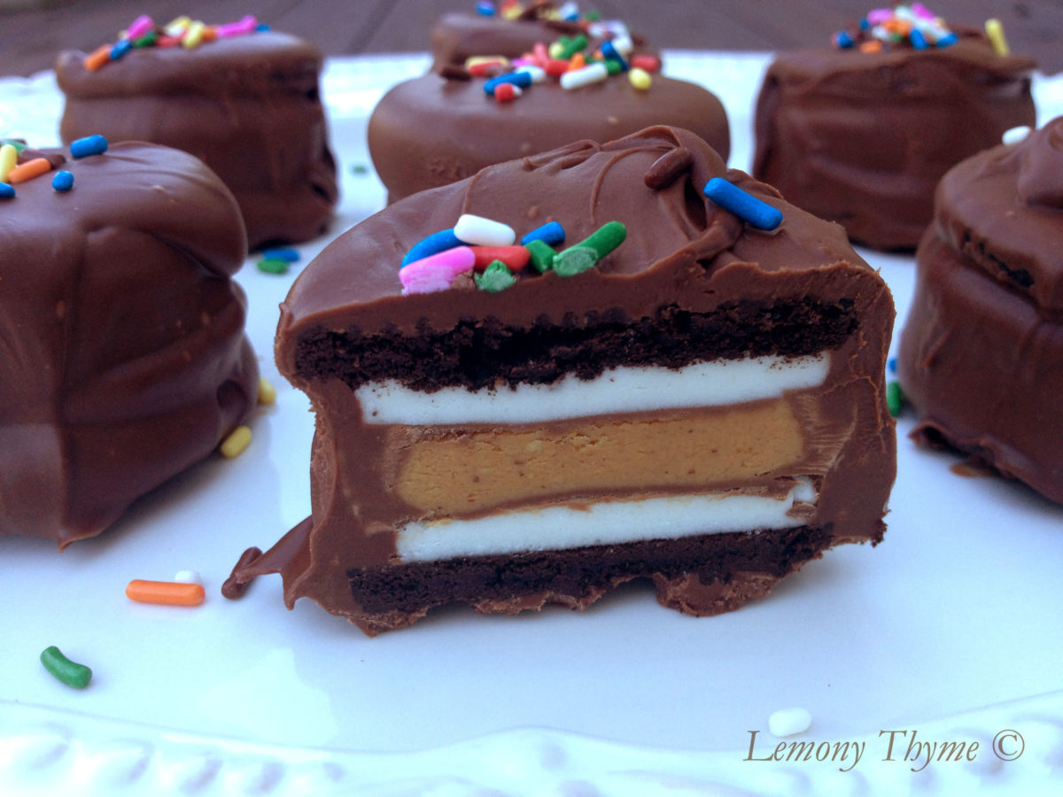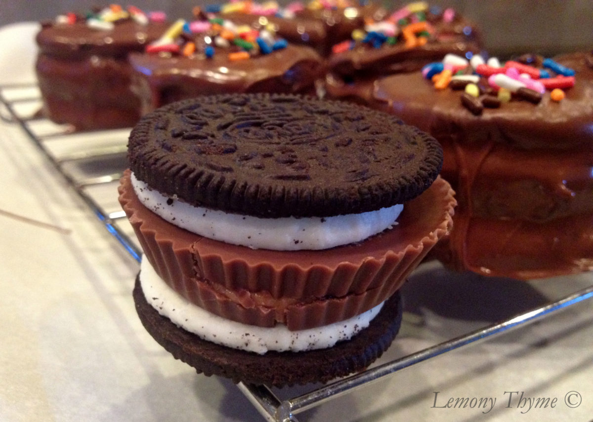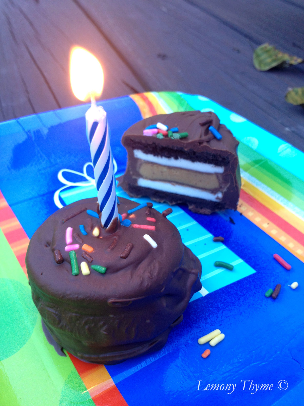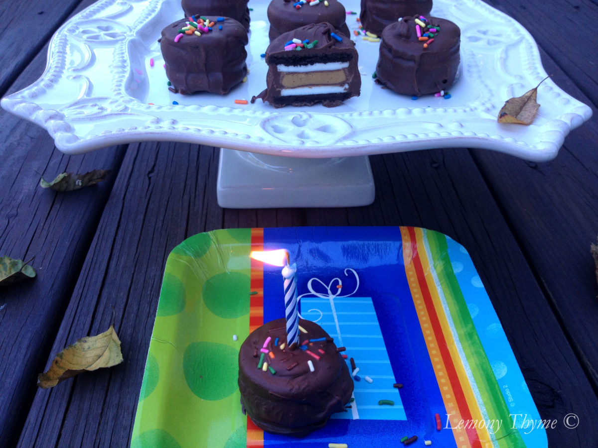 Remove the tops of Double Stuf Oreos, put a Reese’s Peanut Butter Cup in between two cream cookie sides, dunk them in milk chocolate, sprinkle with sprinkles, put a candle in one and get ready to sing….Happy Birthday that is!!