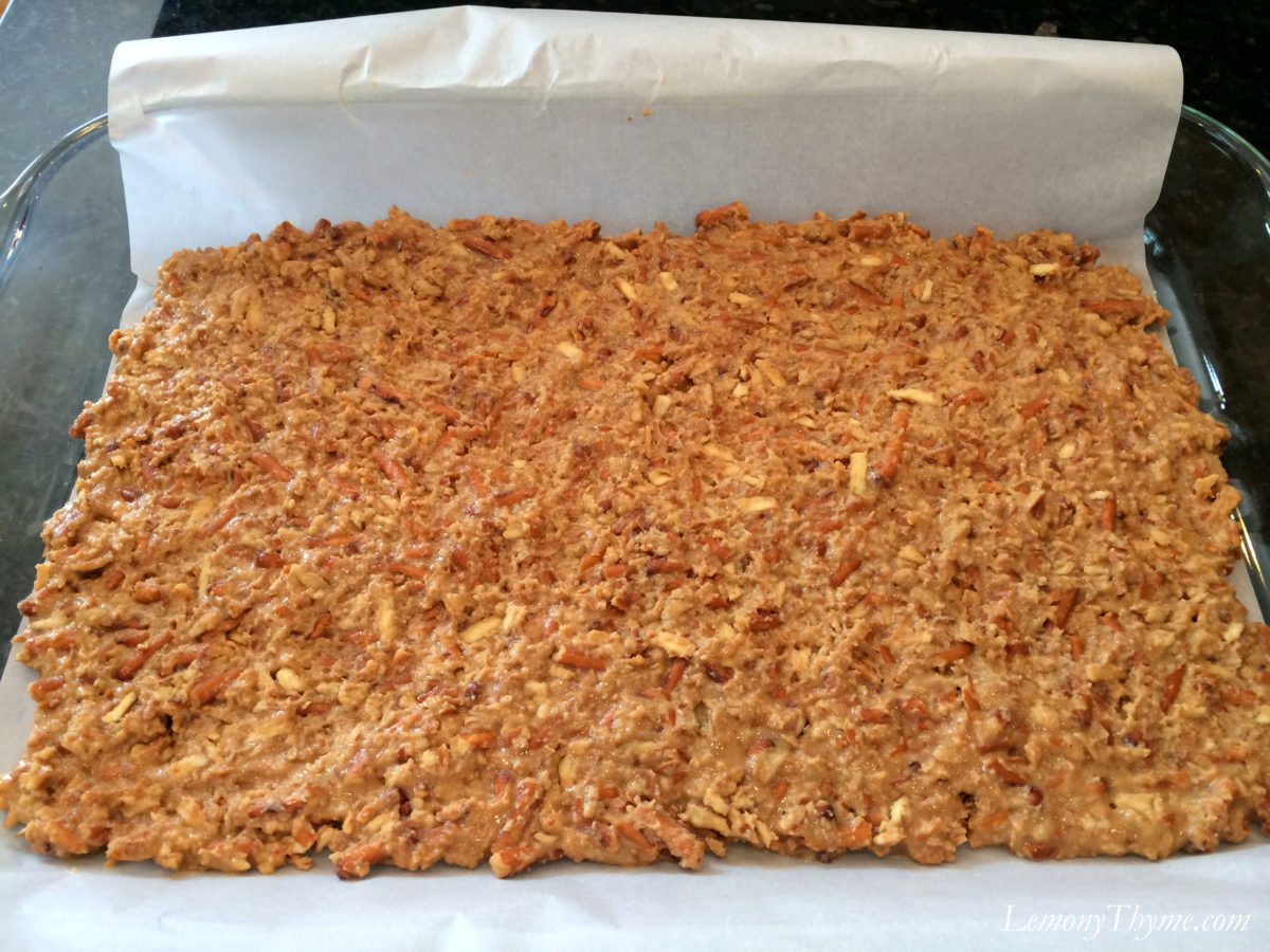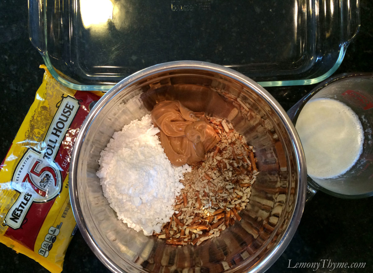 Step #1 ~ Combine crushed pretzels, peanut butter, confectioners sugar, and melted butter; then press into the bottom of a parchment lined 9×13 baking pan.