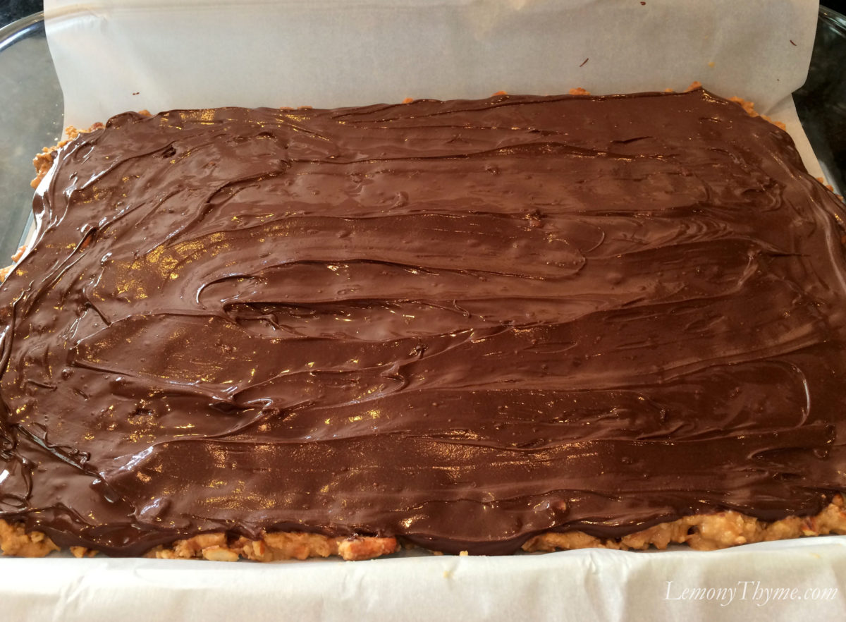 Step #2 ~ Melt chocolate chips with peanut butter in microwave. Spread over pretzel crust and chill for one hour.
