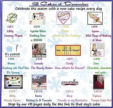 I’m so excited to share that I am one of 12 bloggers who have joined together to deliver you the “12 Cakes of December.” We’ve got a fantastic line-up, so be sure to check back daily as I add links to each new cake.