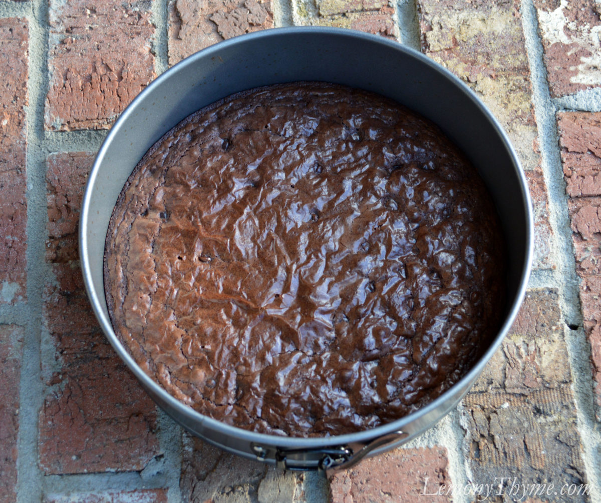 - Remove sides from springform pan. Place brownie bottom on cake plate or serving platter. Spread half ganache onto the brownie. Begin in the center and slowly work it towards the sides.