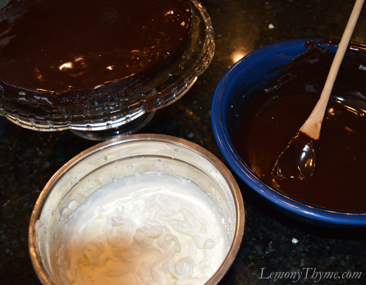 Next comes a layer of chocolate ganache. I call this the chocolate lava layer. If there’s one tricky element to this cake it’s keeping the lava from overflowing. I found letting the ganache cool a bit before spreading made it nice and thick. Once the layer of ganache is set, whipped cream is folded into the remaining ganache, creating a third lighter mousse-like layer. Are you beginning to see why this cake is so special.