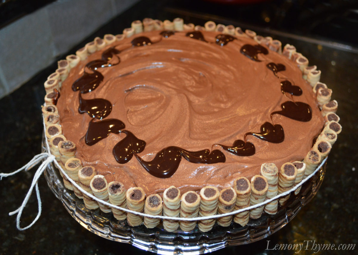 - Gently dip cookies into remaining mousse and press against sides of cake. I tied a piece of butcher’s string around the outside of the cookies to keep them in place until the cake chilled.