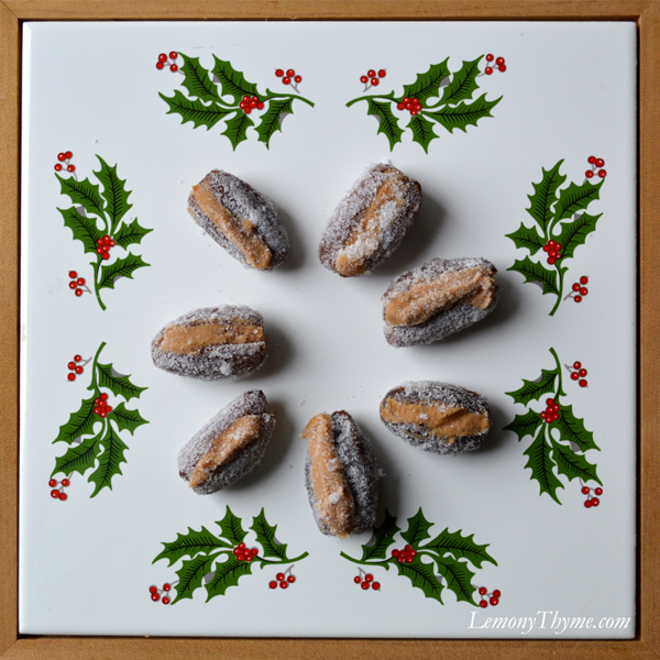 I can’t recall all of the types of cookies we made, but I do remember there was always something for each of us to do. Whether it be rolling out the gingerbread dough, or cutting it into gingerbread men, or placing the raisin eyes as they came out of the oven. One recipe that always comes to mind is Sugar Coated Peanut Butter Stuffed Dates. I don’t remember loving them as a child, but I sure do now.