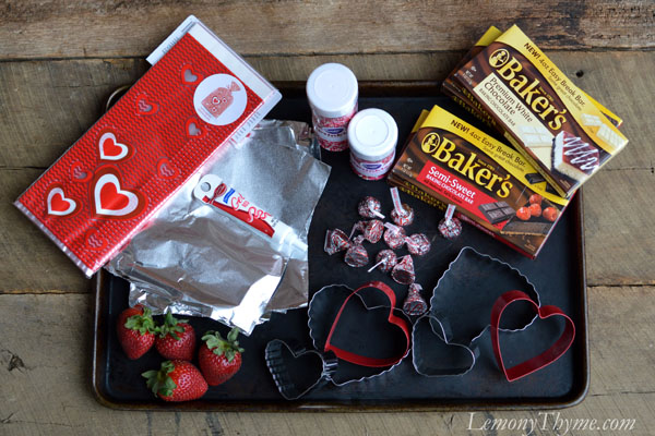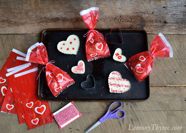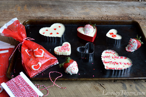 I decided on Cookie Cutter Chocolate Bark in honor of the upcoming holiday (not technically a ‘holiday’ but certainly another excuse for foodies like me to talk about… food). I was able to find inexpensive heart shaped cookie cutters at Walmart (4 for $1.97) along with a couple types of sprinkles and Valentine goodie bags.