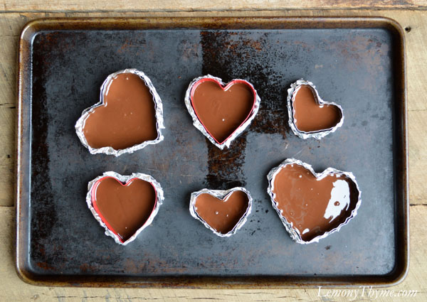Wrap the bottom of each cookie cutter in tin foil and then give them a coating of cooking spray. For the first layer, melt 8 ounces of semi-sweet chocolate and pour it into each heart, filling almost half way. Then refrigerate until set, about 15 minutes.