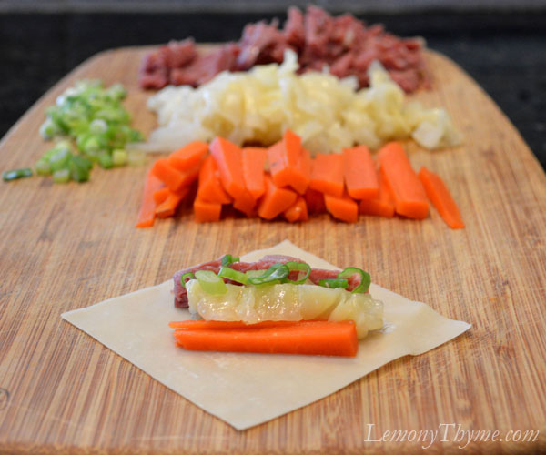I simply julienned the leftover cooked carrots, cabbage and corned beef, then added some thinly sliced scallion. Since I was using smaller wonton wrappers, instead of full sized egg roll wrappers, it didn’t take much to fill them up.