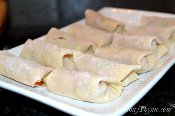 I turned the wrapper at an angle so I could fold in the points from each side, before bring up the bottom point and rolling. A little water on the top edges sealed the rolls.