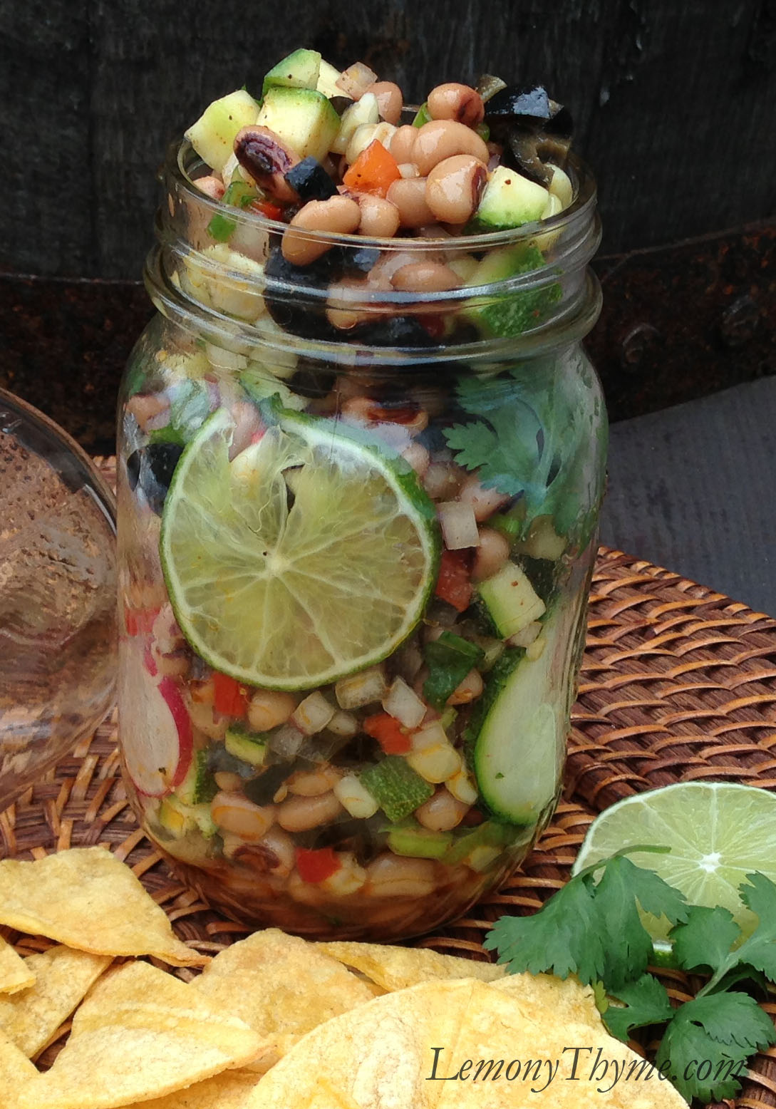 What makes this an easy no fuss recipe is you can substitute any ingredient with what you have on hand.  Just use a nice combination of crunches and colors.  We had a can of black eyed peas in the pantry, but kidney or black beans would be great too.  I used a zucchini for my ‘green’ but avocado is wonderful in this dip as well.  I’m a black olive freak so I added some of those, along with corn, jalapeno, red onion, radish, pimento, garlic, scallion, cilantro and tossed it all in a cumin lime dressing.  Serve Cowboy Caviar with tortilla chips and look how cute it is delivered in a mason jar!!